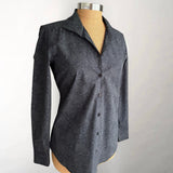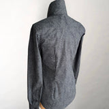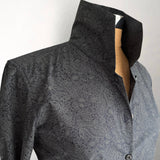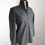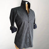 The Ginna shirt features a stand-up collar (can be worn up or folded neatly down) as well as a center front exposed button closure, and signature loop detail. Darts in the back ensure a close fitting style. Classic cuff length. 100% European cotton. Size 6 is approximately 30" long.