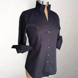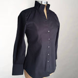 The best selling fitted style from Claridge and King with a beautiful new statement collar. 2 inch stand-up pleated collar with a flattering V-neck. Versatile 4-inch long barrel cuffs and Mother of pearl buttons. Elongated shirttails you can tuck in or leave hanging out. 100% cotton.