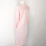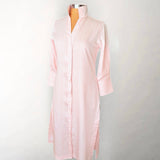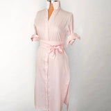 Made exclusively for Shirtini - The League shirt dress from Claridge and King. 100% cotton with a silky finish. Long length with high side slits. Hits just below the knee on most. Side seam pockets (we love pockets). Fabric covered buttons run the entire length of the dress. Bracelet length sleeves. Inspired by their popular fitted shirt, The League, the dress also features a 2 1/2 inch stand-up collar & V-neck opening. Included is a fabric belt to tie or bow as you please. No belt loops so you can wear it unbelted too.