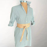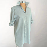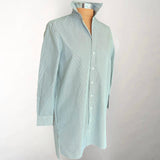 New shirtdress made exclusively for Shirtini from Claridge and King. 100% cotton with a silky feel. Hits just above the knee on most with a slightly longer back. Pointed collar you can flip up (we always do) or fold neatly down. Mother of pearl buttons run the length of the dress.