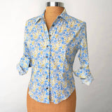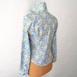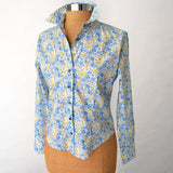 Beautiful fitted shirt in a Liberty of London blue & yellow floral. A crisp collar you can flip up (we always do) or fold neatly down. Mother of pearl buttons. Full length sleeves with 3 1/2 inch double button cuffs. Darts in the front and back. 100% Japanese cotton.