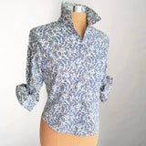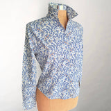 Beautiful fitted shirt in a Liberty of London blue floral. A crisp collar you can flip up (we always do) or fold neatly down. Mother of pearl buttons. Full length sleeves with 3 1/2 inch double button cuffs. Darts in the front and back. 100% Japanese cotton.