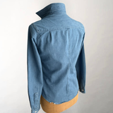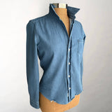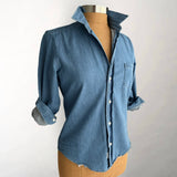 Casual luxury from Frank and Eileen in a super soft stonewashed Italian denim. Hand frayed and distressed, each piece has its own unique lived-in look. Wear out, tucked, half tucked, or tied. Single chest pocket. Long sleeves. Mother of pearl buttons.