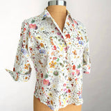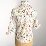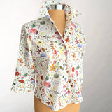 Beautiful fitted shirt in a Liberty floral cotton. A crisp collar you can flip up (we always do) or fold neatly down. Mother of pearl buttons. 3/4 notched sleeves. 100% Japanese cotton.