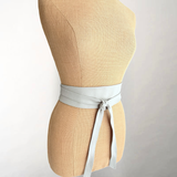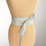 The Obi Wide belt gives you a few extra inches to tie or bow as you please. Approximately 86" long and 3" wide at widest point. The mannequin shown has a 27" inch waist. Each belt is unique and may vary slightly in both size and color. Need something a bit narrower? Try our Obi Slim Belt.