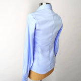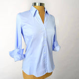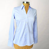 Beautiful fabrics and exceptional tailoring from Italian shirtmaker Caliban. Fitted v-neck style in a lovely stretch cotton. Pointed collar. Very fitted style with darts in the front & back. Long sleeves to style as you please with a double button cuff. Mother of pearl buttons. Cotton stretch blend 70% cotton 27% nylon 3% elastane.