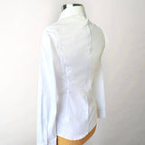 Beautiful fabrics and exceptional tailoring from Italian shirtmaker Caliban. Fitted v-neck style in a lovely stretch cotton. Pointed collar. Very fitted style with darts in the front & back. Long sleeves to style as you please with a double button cuff. Mother of pearl buttons. Cotton stretch blend 70% cotton 27% nylon 3% elastane.