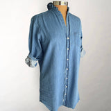 Frank and Eileen's best selling Eileen silhouette with added length to wear as a dress or tunic. Wear alone or layer with leggings or skinny jeans. Stonewashed and hand distressed for a lived-in look. Features a ruffled stand-up collar. Super soft 100% Italian Cotton.