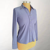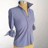 A wonderful shirt for travel! May be worn out, tied, or tucked. Crisp collar to pop or fold neatly down. Long sleeves to style as you please. Single button cuffs. Mother of pearl buttons. 85% nylon, and 15% elastane.