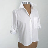 A new style from Claridge + King. A "cropped" version of their Modified Boyfriend shirt. This style skims the low waist - allowing you to wear it layered under a jacket or out on its own. Long sleeves with 4 inch barrel cuffs. Mother of pearl buttons. 100% easy care cotton. Size Small is 22 inches in length.
