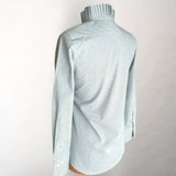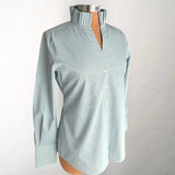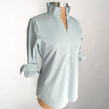The best selling fitted style from Claridge and King with a beautiful new statement collar. 2 inch stand-up pleated collar with a flattering V-neck. Versatile 4-inch long barrel cuffs and Mother of pearl buttons. Elongated shirttails you can tuck in or leave hanging out. 100% cotton.