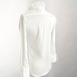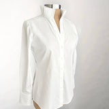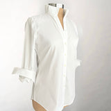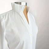 The best selling fitted style from Claridge and King with a beautiful new statement collar. 2 inch stand-up pleated collar with a flattering V-neck. Versatile 4-inch long barrel cuffs and Mother of pearl buttons. Elongated shirttails you can tuck in or leave hanging out. 100% cotton.