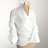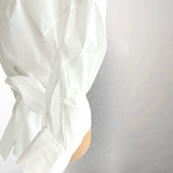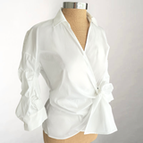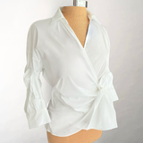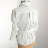 This v-neck style features a tie waist in a beautiful stretch cotton. Gathered 3/4 sleeves with a single button closure. Pointed collar to pop up or fold neatly down. Fitted Style. Made in Italy.